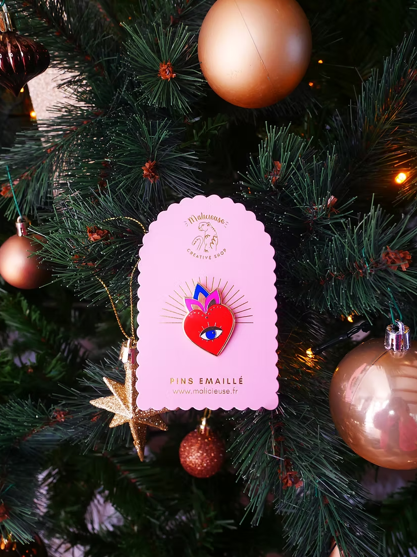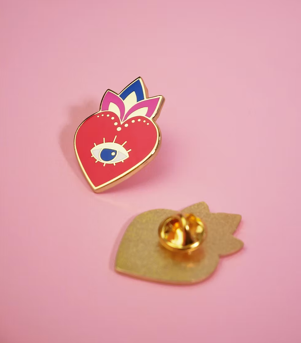 Un pin’s symbolique et mystique, parfait pour ajouter une touche de caractère et de couleur à ton look. Entre cœur sacré, œil protecteur et détails dorés, il attire tous les regards avec style.