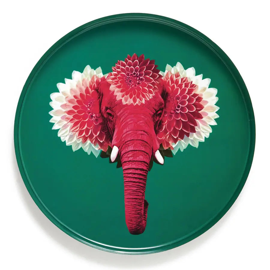 ImaginĂ© par la marque française GangzaĂŻ, ce plateau rond en fer peint Ă la main incarne lâesprit fantasque & dĂ©calĂ© de la marque. Un fond vert profond met en valeur la tĂȘte dâun Ă©lĂ©phant roseârouge aux oreilles en forme de pĂ©tales, sur fond de matiĂšre brute et vernis brillant.