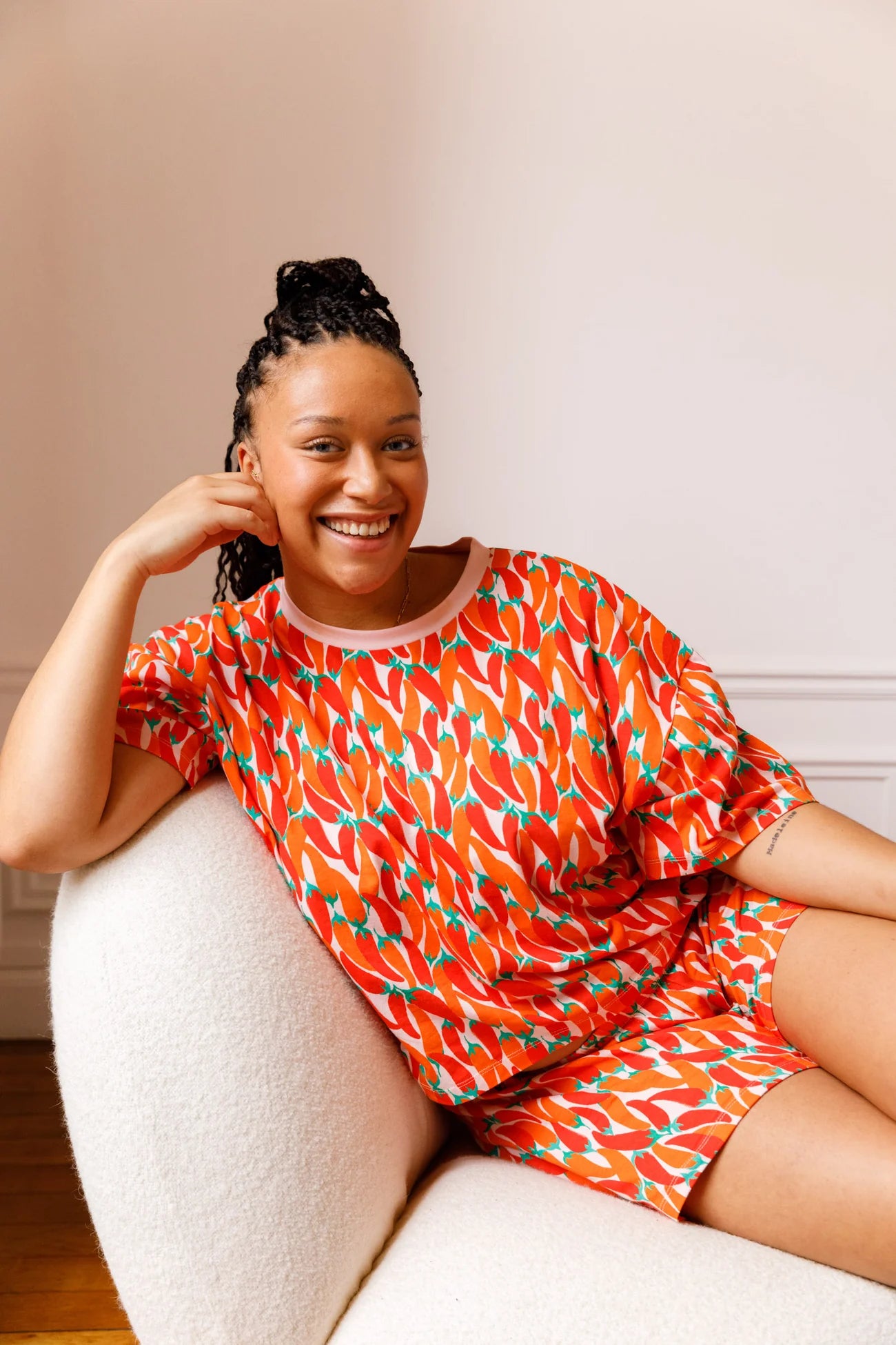 Craquez pour le pyjama Pimientos : un ensemble court en coton bio certifié OEKO‑TEX®, conçu pour un confort optimal. Le t‑shirt oversize se marie parfaitement avec un short à taille élastique, ni trop court, ni trop long – un vrai équilibre entre style et praticité.