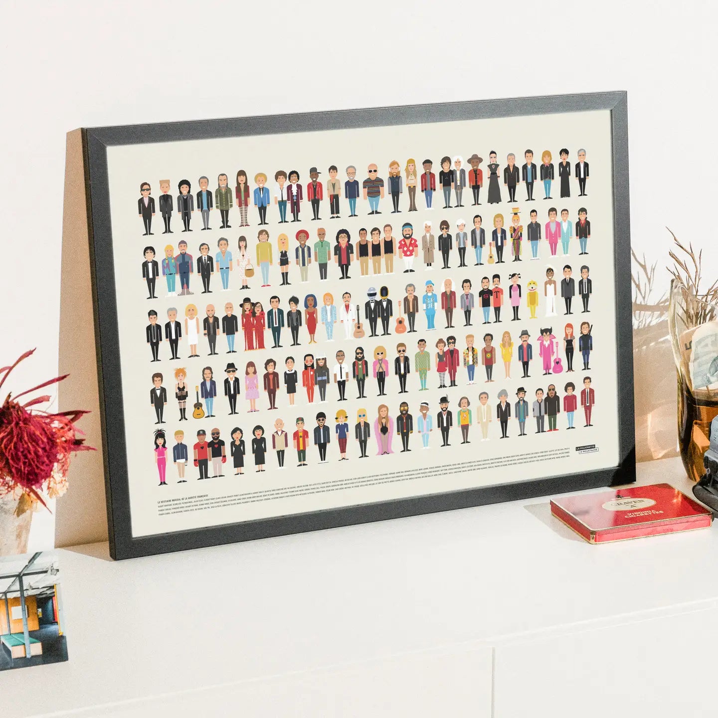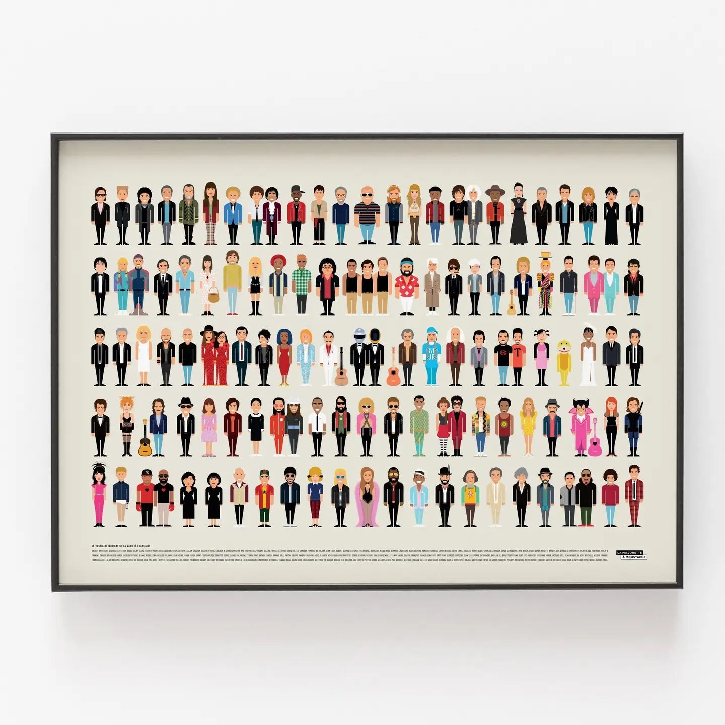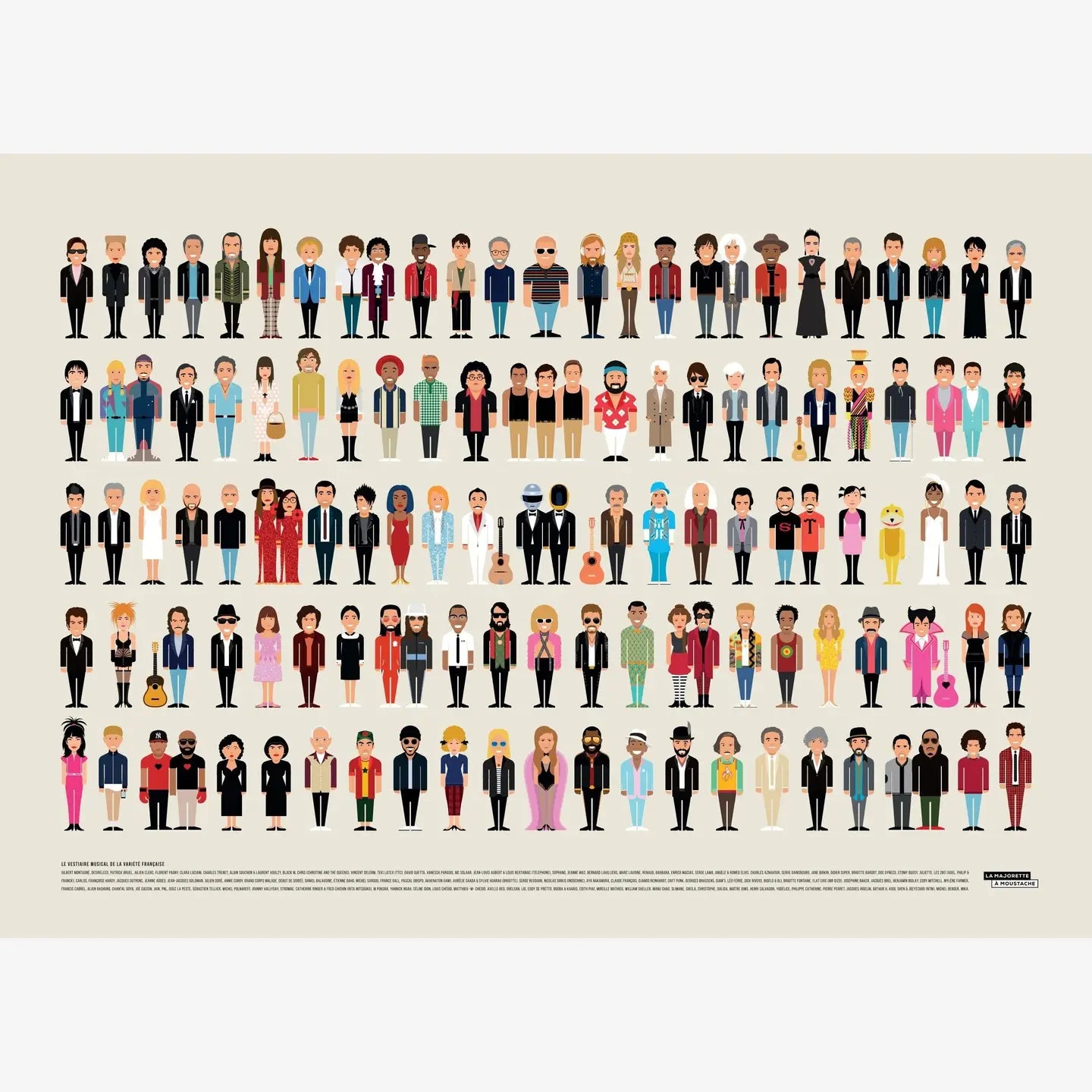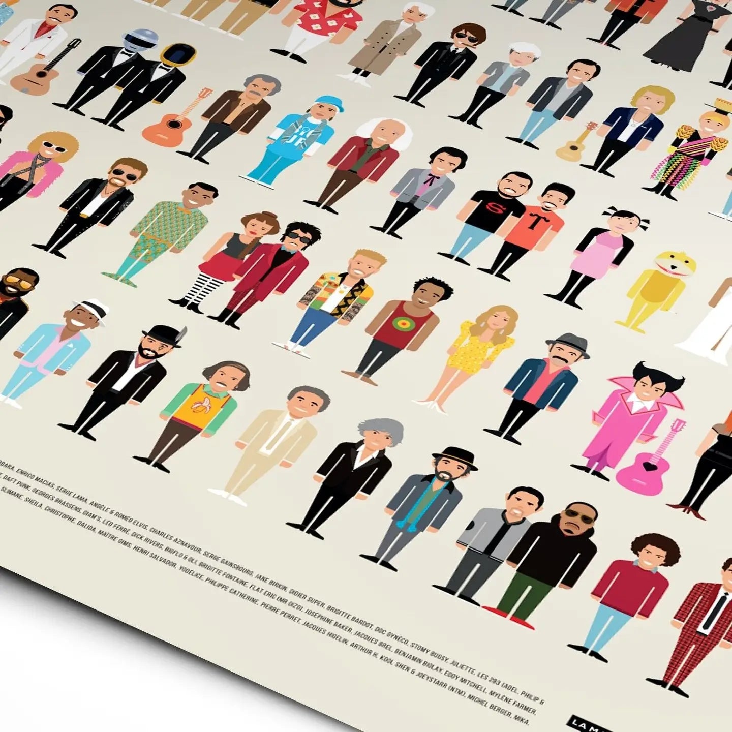 Cette affiche célèbre les grandes voix et les artistes qui ont marqué la variété : de Daniel Balavoine à Eddy de Pretto, en passant par Daft Punk, Orelsan, Booba… Un voyage visuel à travers les genres, du rock à la new wave, en passant par le rap et la pop ✨.